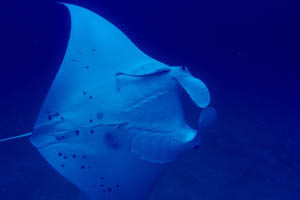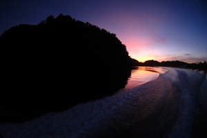 誰もいないブルーコーナー。魚の食欲が活性化する朝まづめの時間帯。ロウニンアジがクマザサハナムロの群れへ捕食アタックをかけるシーンやマンタの捕食シーンなどが見られます。移動中、ゆっくりと東の空が赤く染まります。感動。