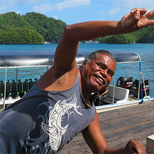 パラオコロール出身。パラオ人としては最年少ガイド。日々成長しようと奮闘中。若いなぁと思っていたら、最近ぽっこりお腹がでてきた。いずれ大きく横に成長するんじゃないかと心配している。いや、間違いなく成長する。。横に進んでいく新型バブルリングも真上にあがるオリジナルバブルリングも鳥肌が立つくらいの完成度。リクエストしてください。バブルリング プリーズ!!本名はモルガン・ルーベン・ベンジャミン。16歳からダイビングの仕事につき現在は一児のパパに。娘にメロメロ。