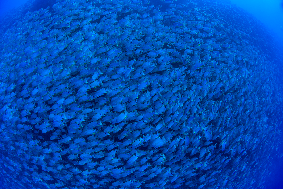 例年3月と4月の新月前にペリリューイエローウォール、ペリリューエキスプレスにて数万個体のイレズミフエダイが目撃されます。10日間程度リーフに滞在し産卵日までその数を増やし続けます。1日毎に2倍・4倍・8倍・16倍と産卵日まで群れは大型化していきます。日程の初期は日中イエローウォールに群れる巨大なイレズミフエダイの群れを狙います。後半日程は早朝の時間帯にコロールを出発し朝の産卵行動を狙います。産卵行動中はブルシャーク・シルキーシャークなど3m級の大型のサメが観察できます。ここ数年はジンベエザメも観察されます。