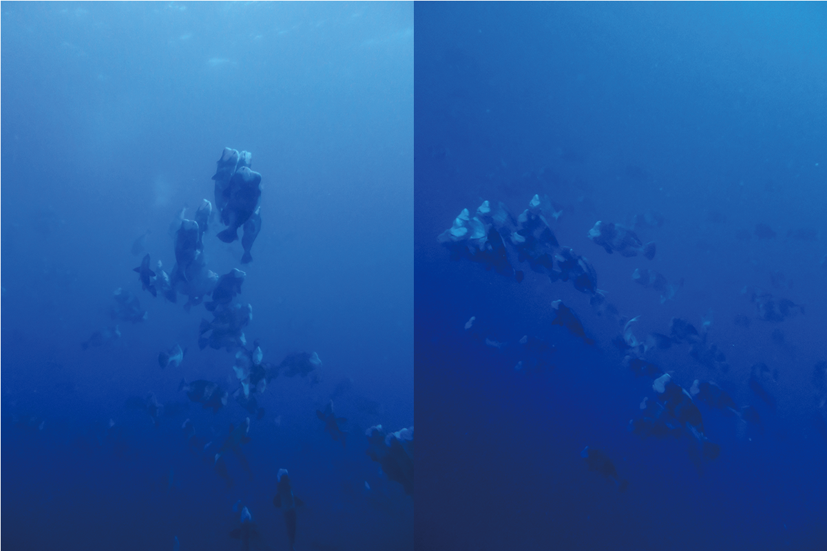 新月前の早朝ダイブにてグラスランドのカンムリブダイの大産卵を狙います。下げ潮が徐々に強くなるに従い100個体ほどのカンムリブダイが産卵場所へ集まってきます。1匹のメスに対して10個体程度のオスが水面付近へ向かって泳ぎだし精子と卵子であたりは真っ白に。通年観察できます。